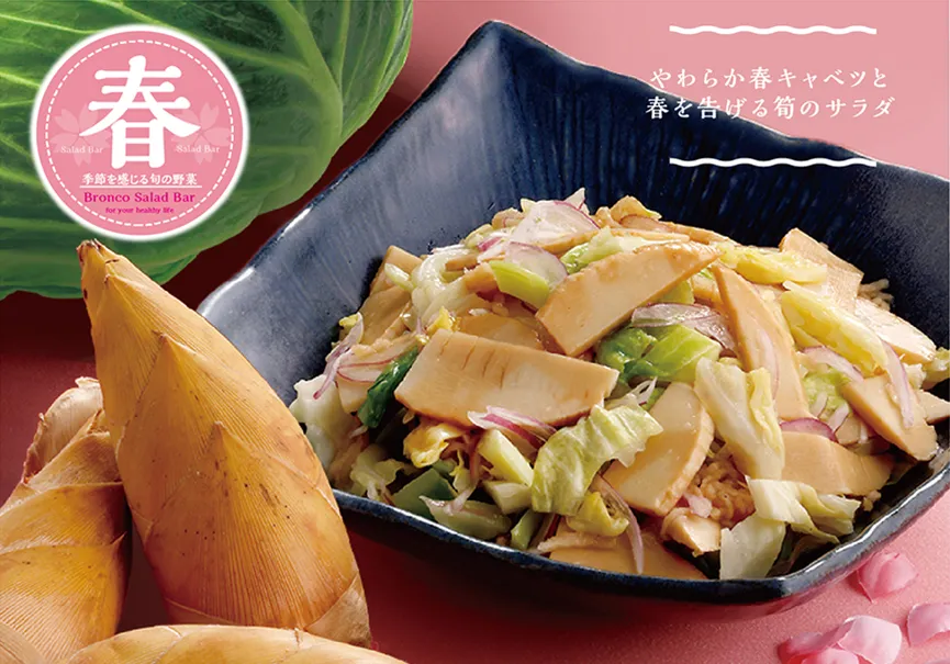 春キャベツ、たけのこ、そら豆など春に旬を迎える野菜を使用した、ブロンコビリー自慢のオリジナルサラダをお楽しみください。